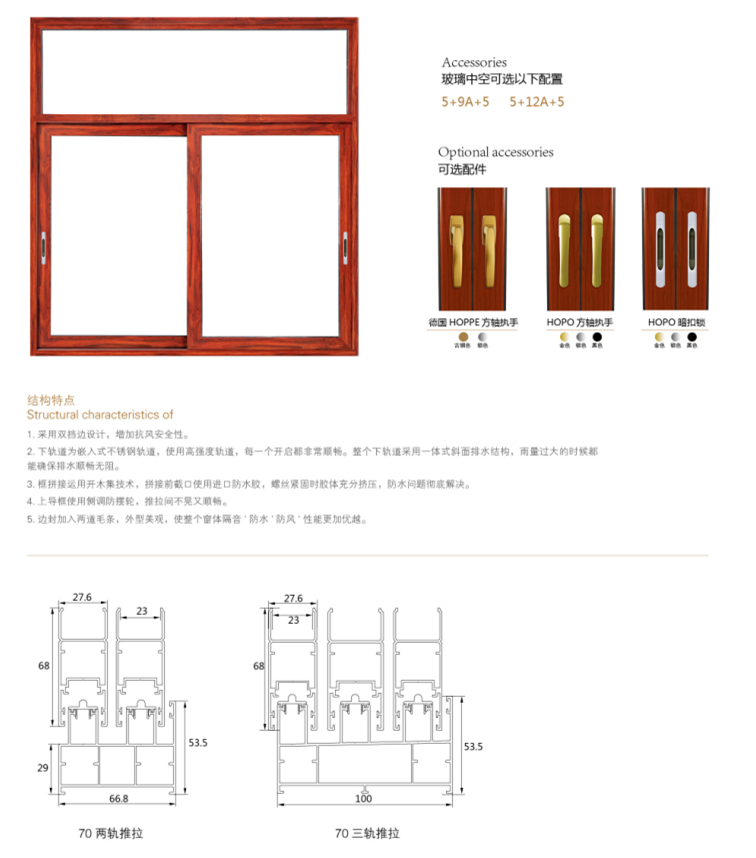 【產品系列】:塞納 【產品性能】:水密性能5級、隔音性能≥35DB、氣密性能6級、抗風壓性能8級、保溫性能K≤2.5 【產品結構】:采用6063-T5鋁材,防水軌隱藏排水結構,四道防撞膠條密封設計,5+20A+5中空玻璃 【五金配件】:標配好博窄邊暗鎖