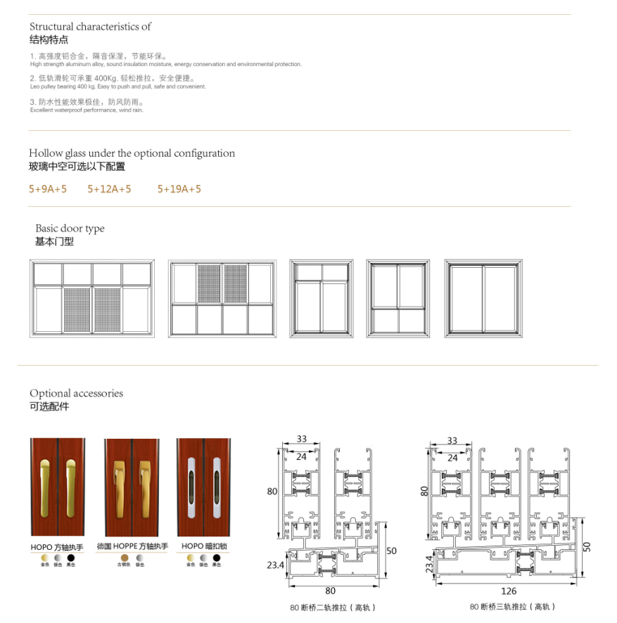 【產(chǎn)品系列】:塞納 【產(chǎn)品性能】:水密性能5級(jí)、隔音性能≥35DB、氣密性能6級(jí)、抗風(fēng)壓性能8級(jí)、保溫性能K≤2.5 【產(chǎn)品結(jié)構(gòu)】:采用6063-T5鋁材,防水軌隱藏排水結(jié)構(gòu),四道防撞膠條密封設(shè)計(jì),5+20A+5中空玻璃 【五金配件】:標(biāo)配好博窄邊暗鎖