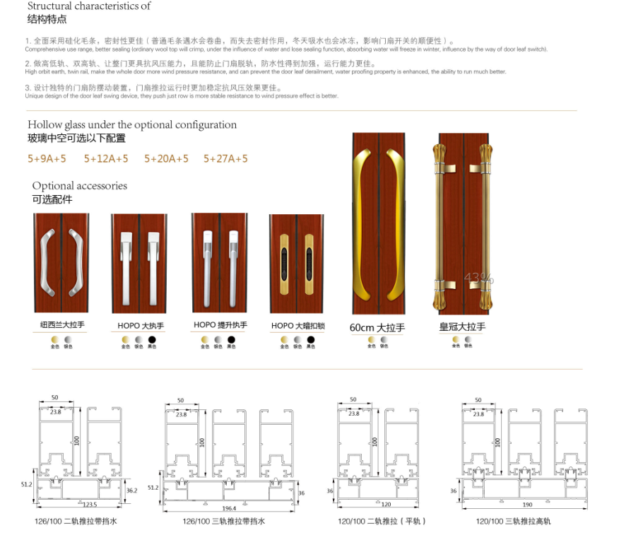 【產品系列】:塞納 【產品性能】:水密性能5級、隔音性能≥35DB、氣密性能6級、抗風壓性能8級、保溫性能K≤2.5 【產品結構】:采用6063-T5鋁材,防水軌隱藏排水結構,四道防撞膠條密封設計,5+20A+5中空玻璃 【五金配件】:標配好博窄邊暗鎖