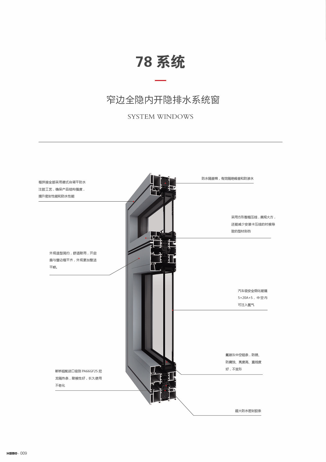 【產品系列】:塞納 【產品性能】:水密性能5級、隔音性能≥35DB、氣密性能6級、抗風壓性能8級、保溫性能K≤2.5 【產品結構】:采用6063-T5鋁材,防水軌隱藏排水結構,四道防撞膠條密封設計,5+20A+5中空玻璃 【五金配件】:標配好博窄邊暗鎖