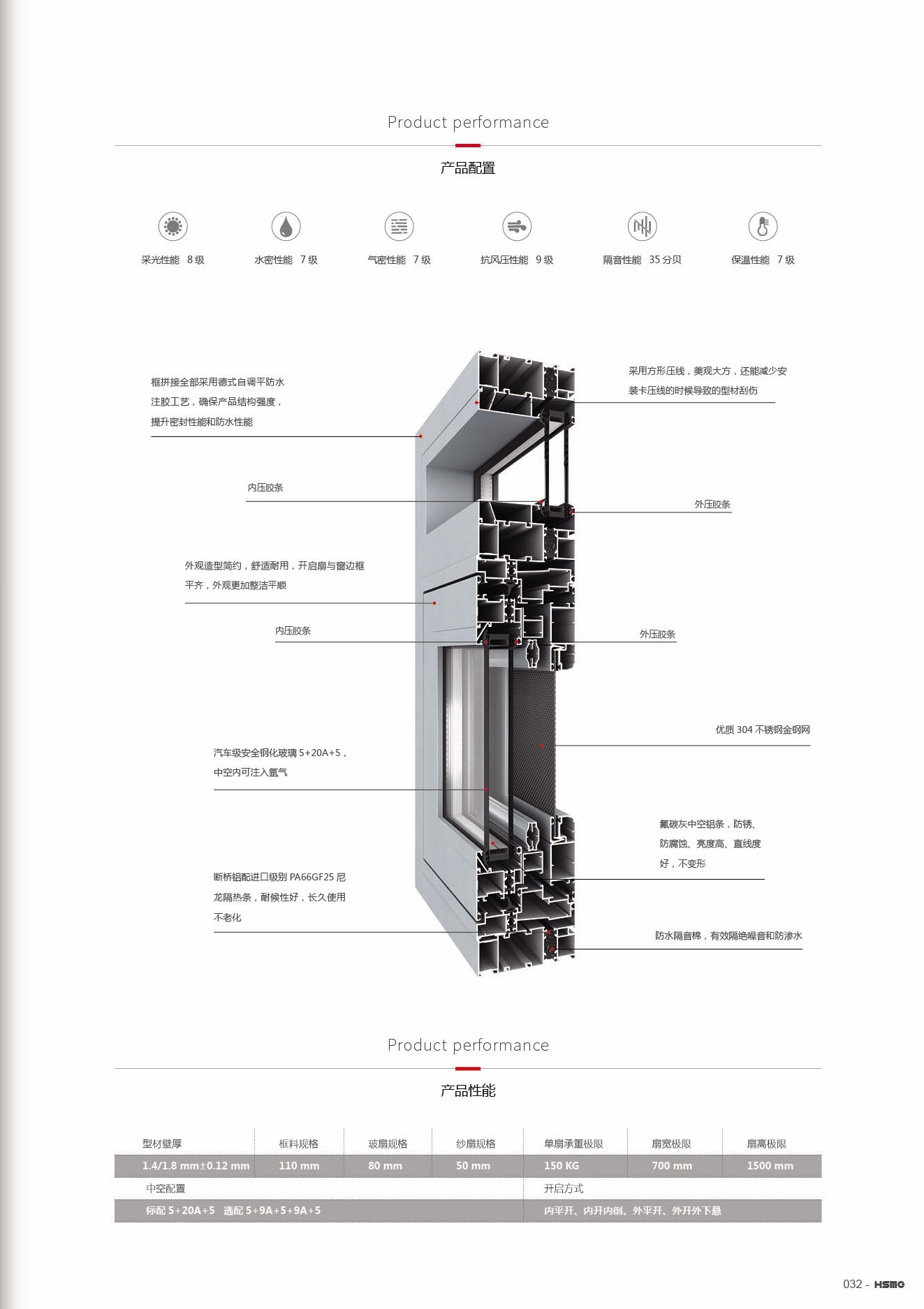 【產(chǎn)品系列】:塞納 【產(chǎn)品性能】:水密性能5級(jí)、隔音性能≥35DB、氣密性能6級(jí)、抗風(fēng)壓性能8級(jí)、保溫性能K≤2.5 【產(chǎn)品結(jié)構(gòu)】:采用6063-T5鋁材,防水軌隱藏排水結(jié)構(gòu),四道防撞膠條密封設(shè)計(jì),5+20A+5中空玻璃 【五金配件】:標(biāo)配好博窄邊暗鎖