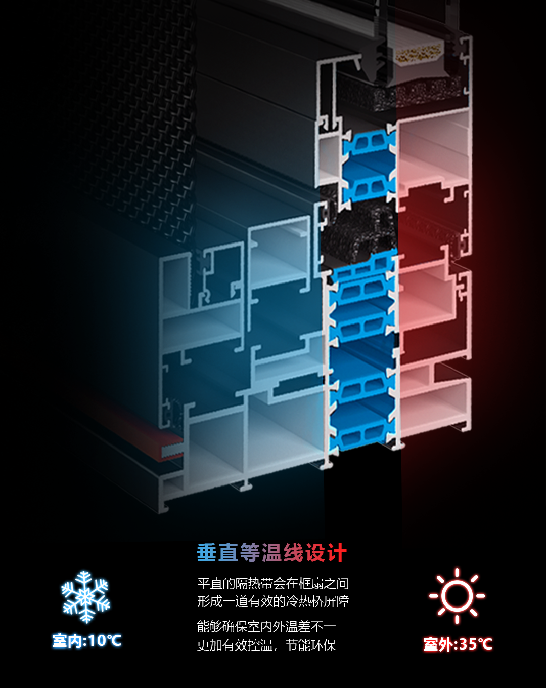 HSMC漢森門窗采用多腔體斷橋鋁結構,特殊的多道密封防水設計,使得水、氣分為兩個獨立的腔室,這樣也就在一定程度上提高了門窗的水、氣密性能,極大限度地減少空氣對流造成的室內外熱量傳導。同時,在隔熱條的選用上也有嚴格要求。在維持最佳性能的同時,通過垂直等溫線設計阻止門窗直接的熱傳導、最大程度上降低熱導系數、優化隔熱效率、降低能量消耗、保持舒適的室內溫度。